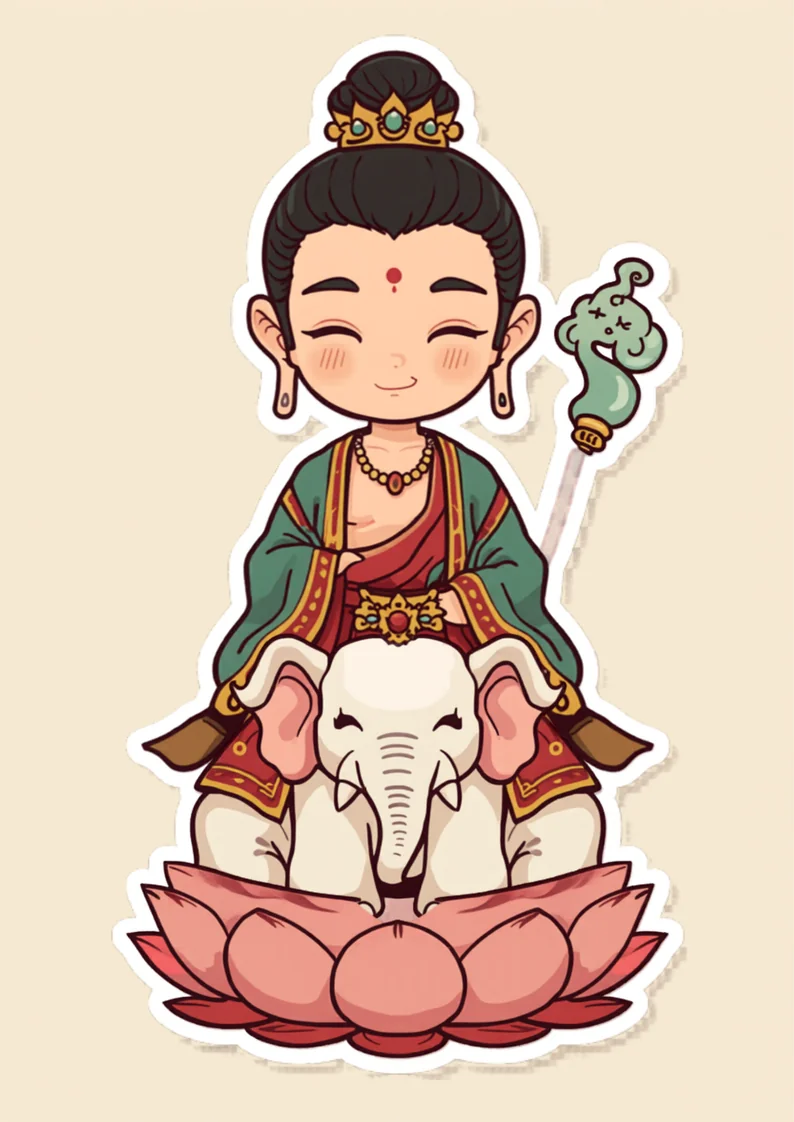 普賢菩薩(梵名 Samantabhadra,意譯「普遍賢善」)是大乘佛教「大行」象徵,乘六牙白象、立十大願王, 與文殊菩薩並稱釋迦佛兩大脅侍,道場為四川峨嵋山,與文殊智慧相對為行願實踐。