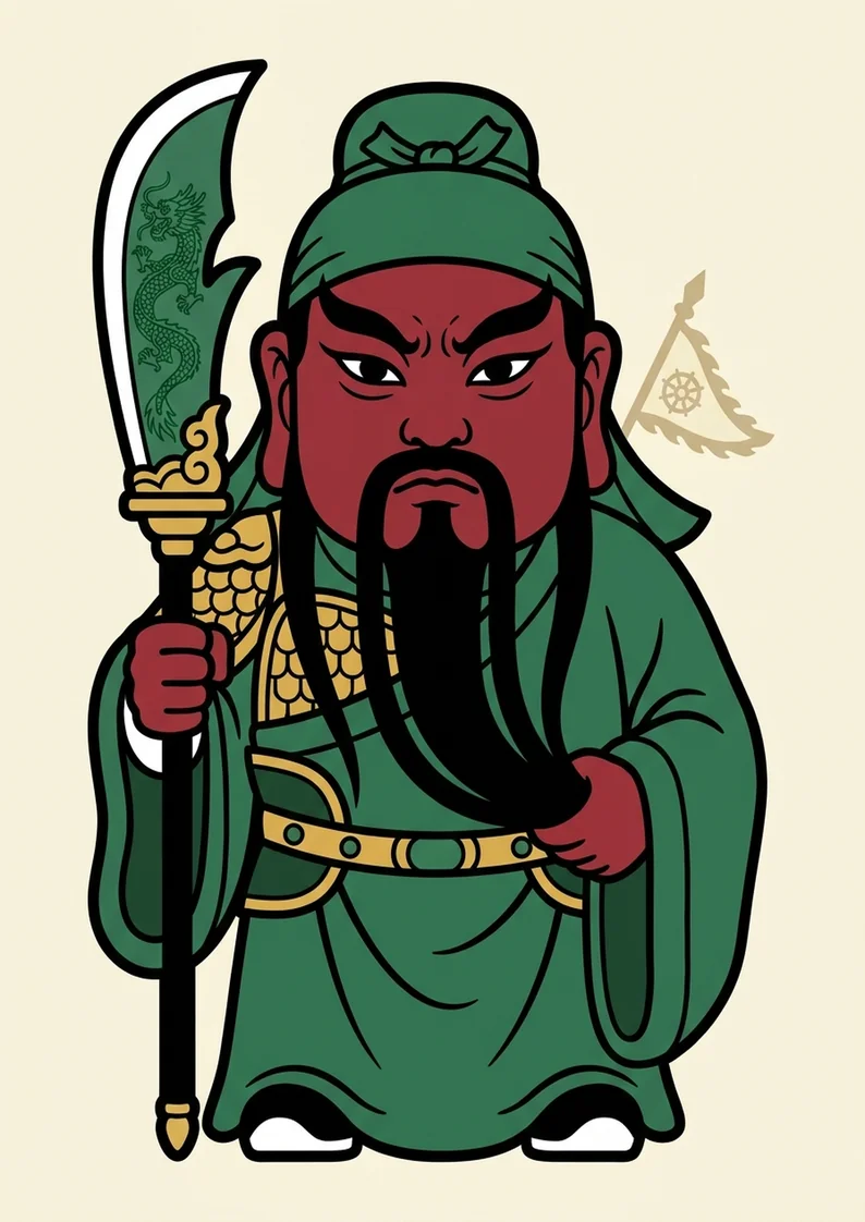 第二、袍服/持物:身披綠色戰袍(傳統關羽綠袍紅臉)或紅色戰袍, 袍上繡龍紋或雲紋;左手持書卷《春秋》(象徵其儒將身份)、 右手持青龍偃月刀(或杖於手側),刀身彎曲如月、刀柄有綠色纏繩。 見「綠袍+青龍刀+春秋書」者,必為關羽。