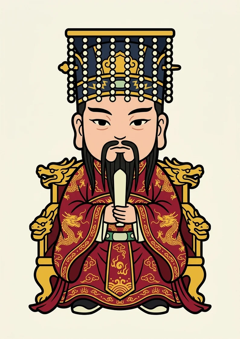 第四、面容與位置:中年帝王相,面容威嚴剛毅,多為五綹長鬚。膚色多為紅褐或深色, 象徵雷部的威猛。神位通常與其他三御合祀於「四御殿」,左右對稱排列。 若見帝王相、青袍、持雷令、與紫微后土同殿,即為天皇大帝。