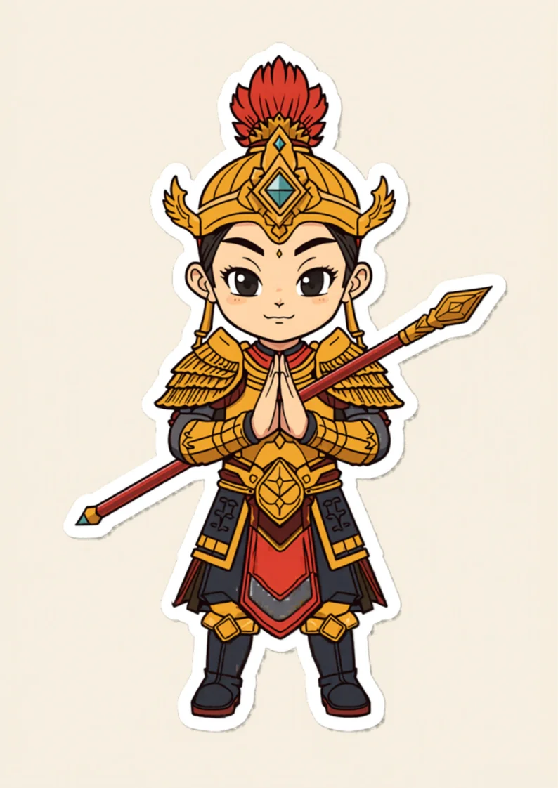 第二、袍服/持物:身披金色戰袍與鎧甲(武將全身戰甲), 襟口、袖口繡有精美雲紋與龍紋,領口披肩甲;最關鍵辨識為「金剛寶杵」—— 右手或雙手持一件長條形金剛杵(兩端膨大如蓮苞),或扛肩、或平端、或拄地。 見到武將童子相持金剛杵者,幾乎可以確認是韋馱。